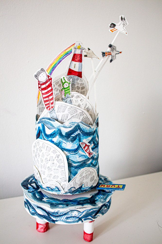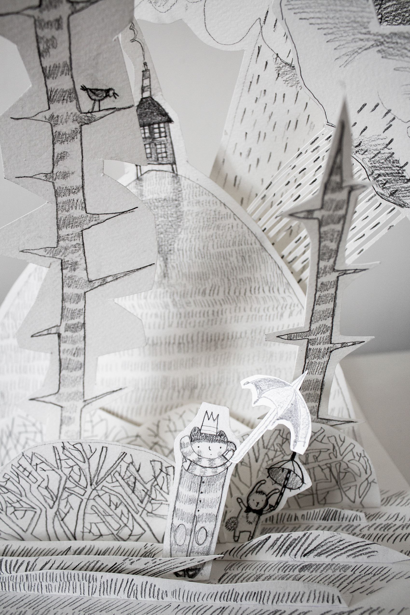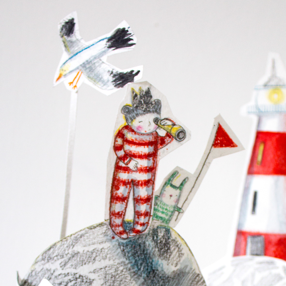 Hand drawn, paper dioramas featuring Bunny Gareth and Joan.